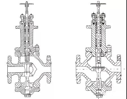 下圖給出直通(tōng)單閥座和(hé)直通(tōng)雙閥座的典型結構,它由上(shàng)閥蓋(或高(gāo)溫上(shàng)閥蓋)、閥體(tǐ)、下閥蓋、閥芯與閥杆組成的閥芯部件、閥座、填料、壓闆等組成。