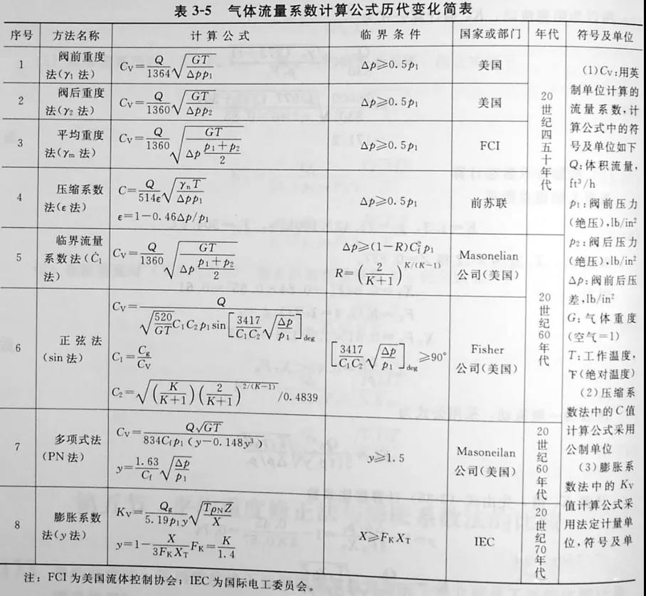 對不可(kě)壓縮流體(tǐ)——液體(tǐ)的一般計(jì)算(suàn)公式,各個(gè)都差異不大(dà),而對于可(kě)壓縮流體(tǐ)則不同。可(kě)壓縮流體(tǐ)流量系數(shù)的計(jì)算(suàn)比一般液體(tǐ)要複雜,其原因是可(kě)流體(tǐ)經節流之後體(tǐ)積膨脹、密度減小(xiǎo),而且在P1不變和(hé)△P增加到一定程度時(shí),通(tōng)過節流孔後會(huì)達到臨界狀态,産生(shēng)阻塞流,因此必須考慮這些(xiē)因素的影(yǐng)響而對計(jì)算(suàn)公式加以修正。主要的氣體(tǐ)流量系數(shù)計(jì)算(suàn)公式見表3-5。