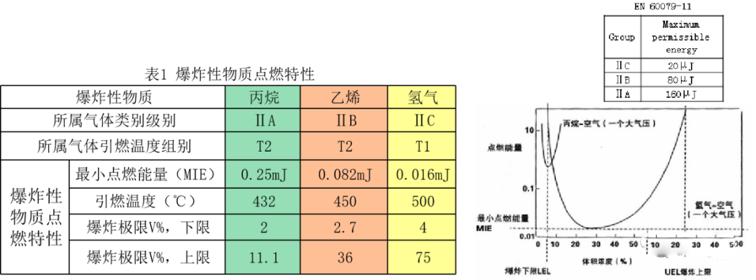 爆炸性氣體(tǐ)物質不同點燃特性的舉例見表1。
