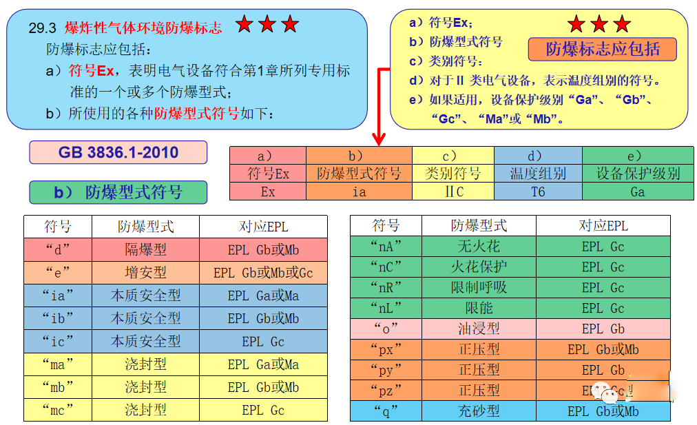 GB 3836.1-2010 爆炸性環境 第1部分:設備 通(tōng)用要求29.14 标志(zhì)示例 易産生(shēng)瓦斯的煤礦用隔爆外殼“d”(EPL Mb):Ex d Ⅰ Mb 或 Ex db Ⅰ。 帶本質型“i”(EPL Ga)輸出電(diàn)路的隔爆外殼Ex元件“d”(EPL Gb),用于除易産生(shēng)煤礦瓦斯氣體(tǐ)外的C級爆炸性氣體(tǐ)環境(防爆合格證編好後加符号“U”):Ex d[ia Ga] ⅡC Gb 或 Ex db [ia] ⅡC。 使用增安型“e”(EPL Gb)和(hé)正壓外殼“px”型(EPL Gb)的電(diàn)氣設備,高(gāo)表面溫度125℃,用于除易産生(shēng)瓦斯的煤礦外的、引燃溫度高(gāo)于125℃的爆炸性氣體(tǐ)環境,在防爆合格證中注明(míng)使用的具體(tǐ)條件(防爆合格證編好後加符号“X”):Ex e px ⅡC 125℃(T4)Gb 或 Ex eb pxb ⅡC 125℃(T4) 使用隔闆外殼“d”(EPL Mb和(hé)Gb)和(hé)增安型“e”(EPL Mb和(hé)Gb)的煤礦用電(diàn)氣設備和(hé)用于除易産生(shēng)瓦斯的煤礦外的B級氣體(tǐ)、引燃溫度高(gāo)于200℃的爆炸性氣體(tǐ)環境:Ex de Ⅰ Mb 或 Ex db eb ⅠEx de ⅡB T3 Gb 或 Ex db eb ⅡB T3 用于除易産生(shēng)瓦斯的煤礦外的、僅存在氨氣爆炸性氣體(tǐ)環境用的隔爆外殼電(diàn)氣設備“d”(EPL Gb):Ex d Ⅱ氨(NH3)Gb 或 Ex db Ⅱ氨(NH3) 用于具有(yǒu)導電(diàn)性粉塵的爆炸性粉塵環境ⅢC等級澆封型電(diàn)氣設備“ma”(EPL Da),高(gāo)表面溫度低(dī)于120℃:Ex ma ⅢC T120℃ Da 或 Ex ma ⅢC T120℃   IP68 用于具有(yǒu)導電(diàn)性粉塵的爆炸性粉塵環境ⅢC等級“ia”(EPL Da)型電(diàn)氣設備,高(gāo)表面溫度低(dī)于120℃:Ex ia ⅢC T120℃ Da 或 Ex ia ⅢC T120℃   IP20 用于具有(yǒu)導電(diàn)性粉塵的爆炸性粉塵環境ⅢC等級“p”(EPL Db)型電(diàn)氣設備,高(gāo)表面溫度低(dī)于120℃:Ex p ⅢC T120℃ Db 或 Ex pb ⅢC T120℃  IP65 用于具有(yǒu)導電(diàn)性粉塵的爆炸性粉塵環境ⅢC等級“t”(EPL Db)型電(diàn)氣設備,高(gāo)表面溫度低(dī)于225℃,當用500mm的粉塵層試驗時(shí)低(dī)于320℃:Ex t ⅢC T225℃ T500 320℃ Db 或 Ex tb ⅢC T225℃ T500 320℃  IP65