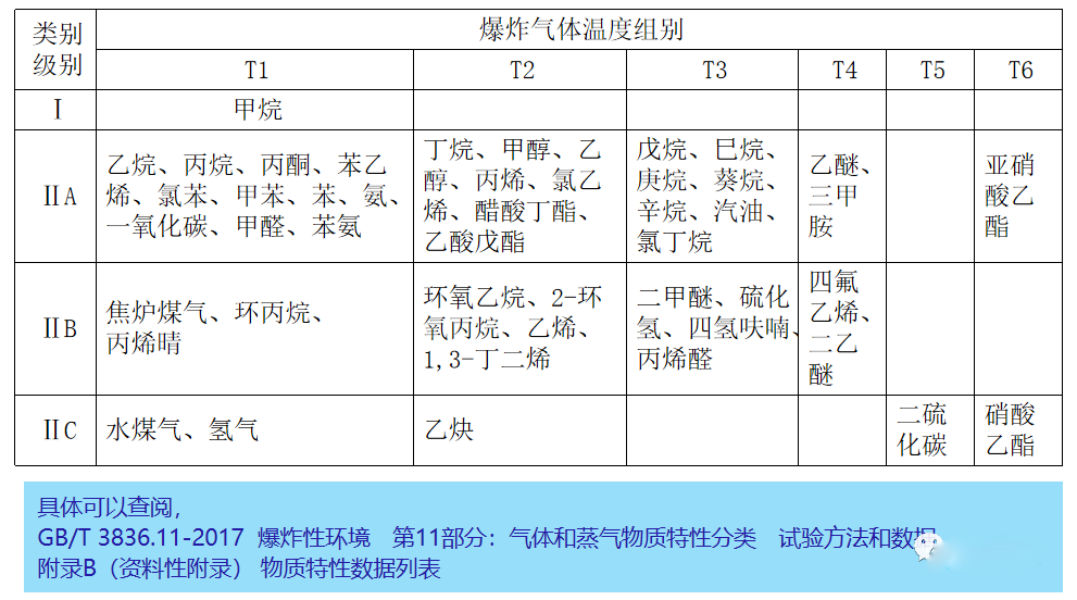 爆炸性氣體(tǐ)分級、分組舉例: