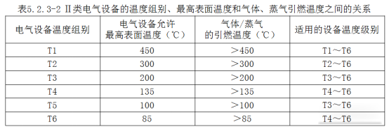 Ⅱ類電(diàn)氣設備的溫度組别、高(gāo)表面溫度和(hé)氣體(tǐ)、蒸氣引燃溫度之間(jiān)的關系符合表5.2.3-2的規定。