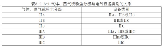防爆電(diàn)氣設備的級别和(hé)組别不應低(dī)于該爆炸性氣體(tǐ)環境內(nèi)爆炸性氣體(tǐ)混合物的級别和(hé)組别。氣體(tǐ)、蒸氣或粉塵分級與電(diàn)氣設備類别的關系應符合表5.2.3-1的規定: