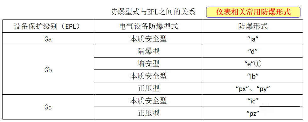 常用防爆儀表的電(diàn)氣設備保護級别(EPL)與電(diàn)氣設備防爆型式的關系應符合下表: