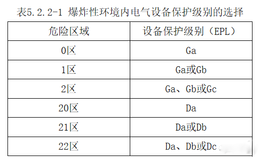 1 爆炸性環境內(nèi)電(diàn)氣設備保護級别的選擇應符合表5.2.2-1的規定。